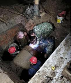 該段水泥管屬于主城區(qū)老舊管網,管道周圍環(huán)境復雜,布有國防光纜、天然氣管道等重要設施,不能動用大型機械,只能通過人工及簡易工具開挖。時間緊,任務重,為爭取搶修時間,搶修人員一邊現(xiàn)場制訂維修方案,一邊聯(lián)系準備各種配件和維修材料。為將對用戶的影響降至最小范圍,水廠實行減壓供水,待開挖和搶修材料一切準備就緒后,搶修人員實行帶水作業(yè),先給套管預留一個DN50鋼管作為導流口,待水泥頭子徹底凝固后再關閉導流口。封堵水泥頭子時,噴涌而出的水流濕透了搶修人員的衣服,速干水泥灼傷了他們的皮膚,但他們沒有一絲退縮,仍爭分奪秒地在水坑中忙碌著搶修工作。
