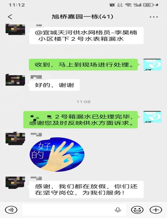 “感謝,我們都在放假,你們還堅(jiān)守崗位,為我們服務(wù)!”10月5日11時(shí)08分,宜城市旭橋嘉園小區(qū)業(yè)主李女士在小區(qū)業(yè)主群里,向襄陽(yáng)水務(wù)集團(tuán)宜城天河供水有限公司網(wǎng)格員李昊楠發(fā)來(lái)感謝消息。而就在23分鐘前,她剛反映家中停水問(wèn)題,現(xiàn)在水管故障已徹底解決,如此高效的服務(wù)響應(yīng)讓業(yè)主倍感貼心。